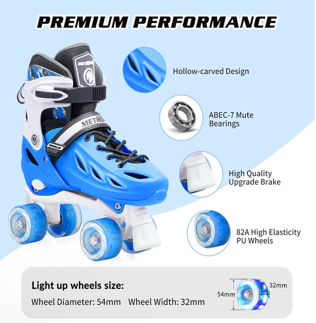 * Unique Roller Skates Belong Only To You Roller skates can be easily adjusted to 4 different sizes with its size-adjustment button. Plus a thicken memory liner,the roller skates will remember the shape of your feet and improve the wrapping of your feet. Create a pair of unique roller skates that belong only to you