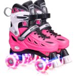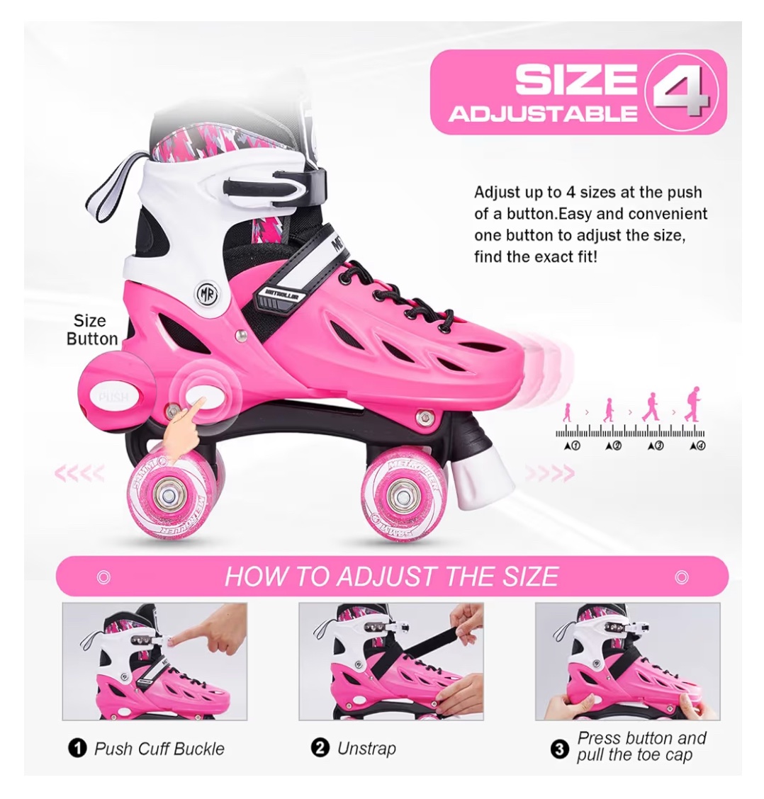 * Unique Roller Skates Belong Only To You Roller skates can be easily adjusted to 4 different sizes with its size-adjustment button. Plus a thicken memory liner,the roller skates will remember the shape of your feet and improve the wrapping of your feet. Create a pair of unique roller skates that belong only to you