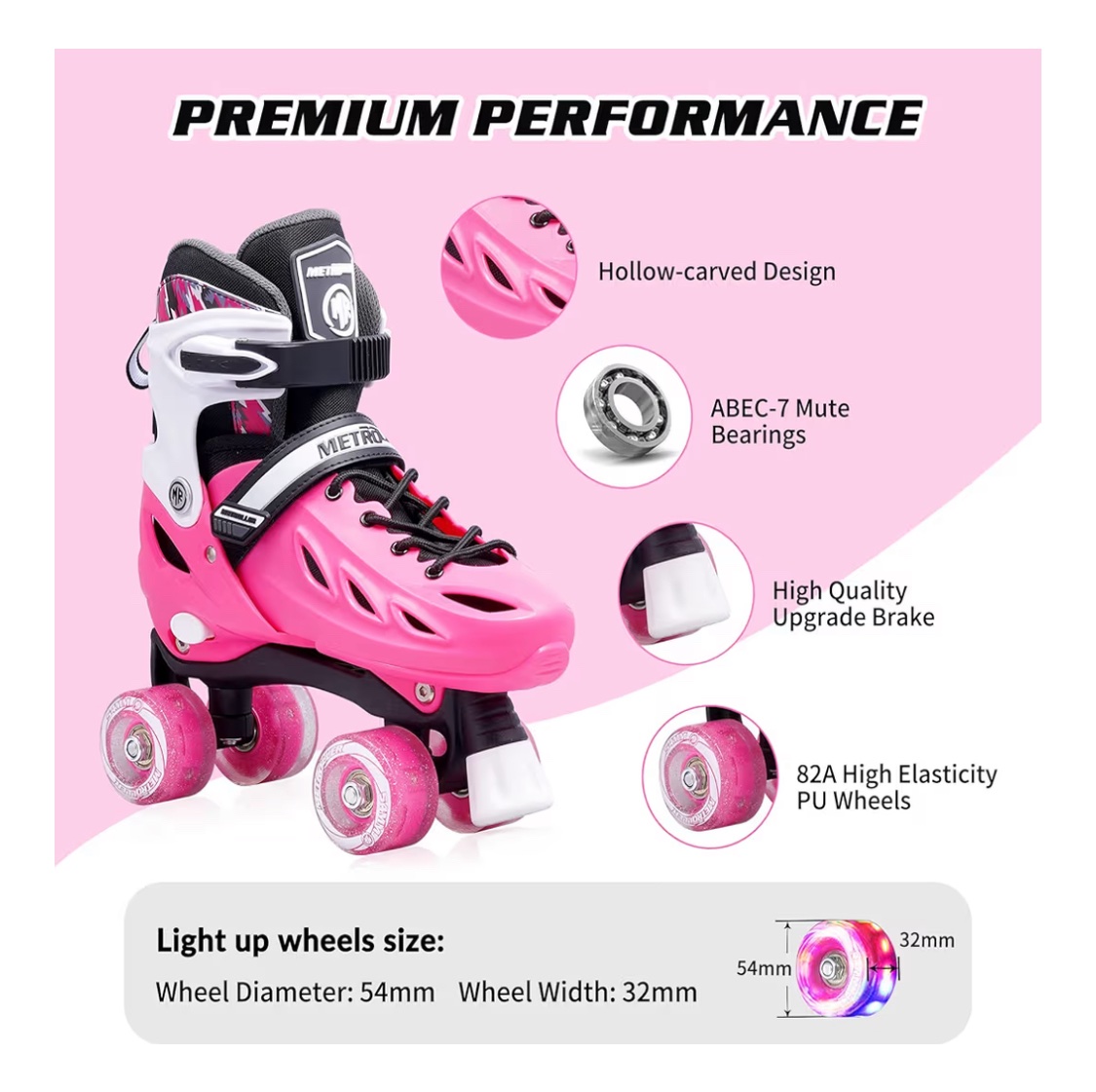 * Professional Roller Skates Reinforced frame, 82A polyurethane wheels & high performance ABEC-7 bearings provide smooth,quiet and safe glides. Built-in toe brakes for safe and reliable stopping power. It will be a good choice whether you are a beginner or a professional