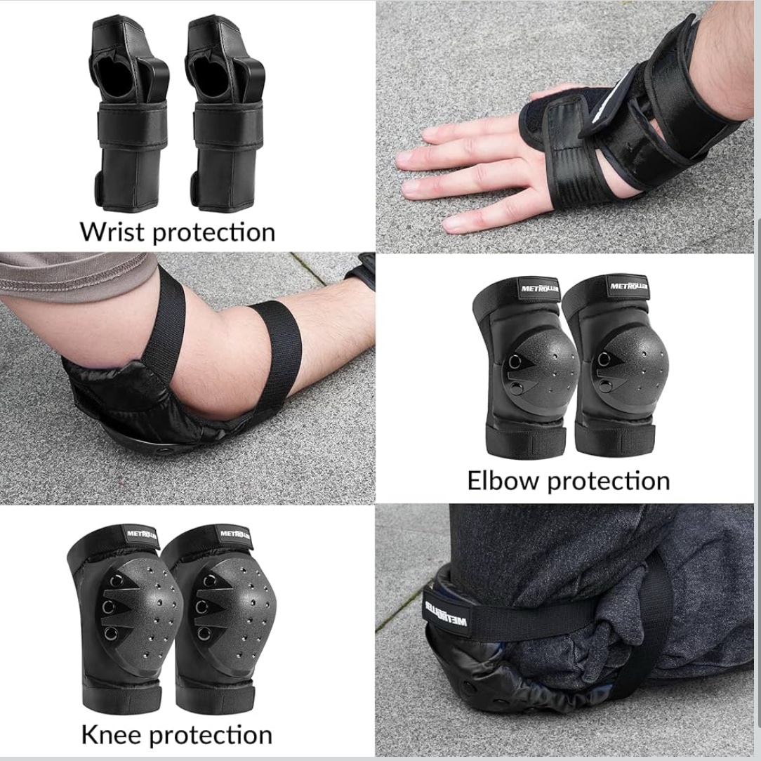 * FIT FOR MULTIPLE SPORTING The protective gear set can be used with roller skating, skateboarding, cycling, scooter and various action outdoor sports to provide you with protection. To prevent the protective gear from falling off and shifting during exercise, please make sure that each part is worn correctly.