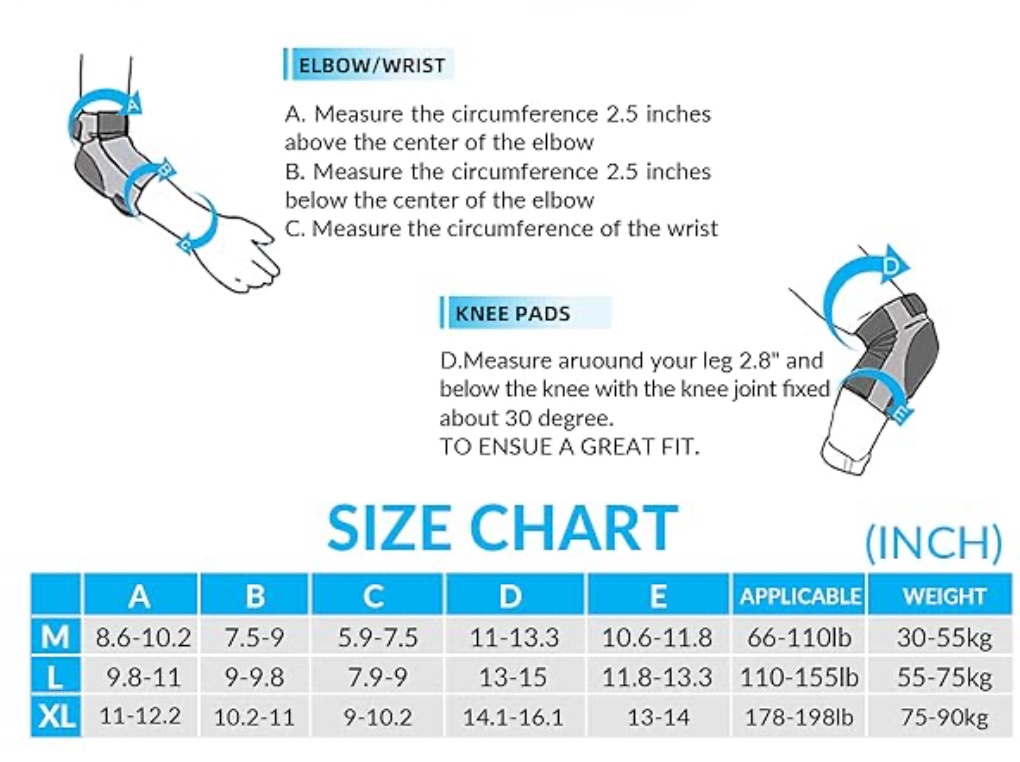 * FIT FOR MULTIPLE SPORTING The protective gear set can be used with roller skating, skateboarding, cycling, scooter and various action outdoor sports to provide you with protection. To prevent the protective gear from falling off and shifting during exercise, please make sure that each part is worn correctly.
